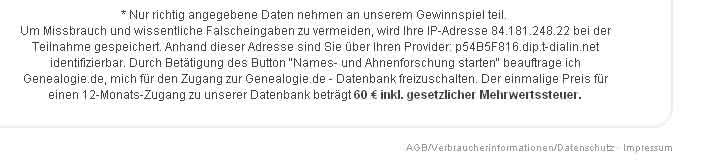 Sollten Sie Fragen zu dieser Rechnung oder unserem Dienstleistungsangebot haben, stehen wir Ihnen unter +49-180-3858-590-528 ( 9 Cent / Minute aus dem dt. Festnetz ) oder info@genealogie.de zur Verfügung.