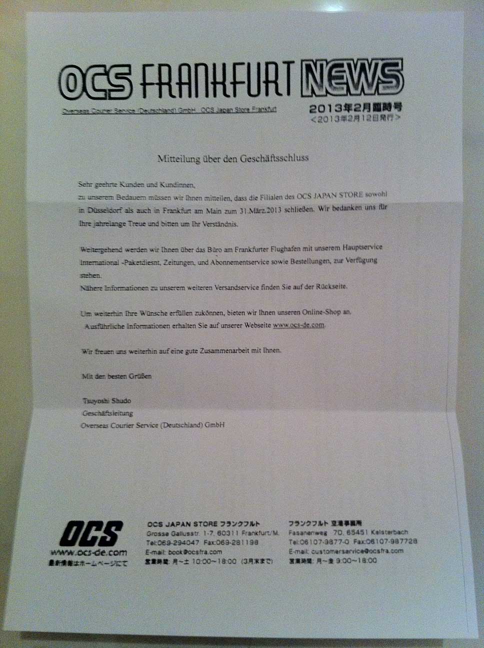 OCS wird am 31.03. seine Läden in Frankfurt und Düsseldorf schließen.