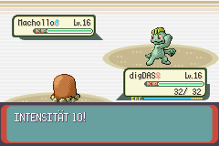 Dann aber wurde es Zeit, sich dem Arenaleiter zu stellen, und ich muss zugeben, ich hatte schon etwas Bammel, was digDAS und Körbchen anging. Kamillos erstes Pokémon war Machollo, welches ich digDAS entgegenstellte, und digDAS machte keine halben Sachen. Nach zwei 8er-Intensitäten und einem Supertrank von Seiten Kamillos haute es eine 10er Intensität raus... zu viel für das arme Machollo.