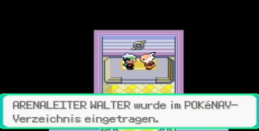 Stattdessen ging's dann also direkt nach Malvenfroh City, wo ich von Walter abgefangen wurde. "Hey, ich hab auf dich gewartet, weil ich deine Hilfe brauche!" Ist ja nicht so, als hätte er mich nach dem Arenakampf irgendwie im Pokenav gespeichert oder so... (siehe Screenshot)