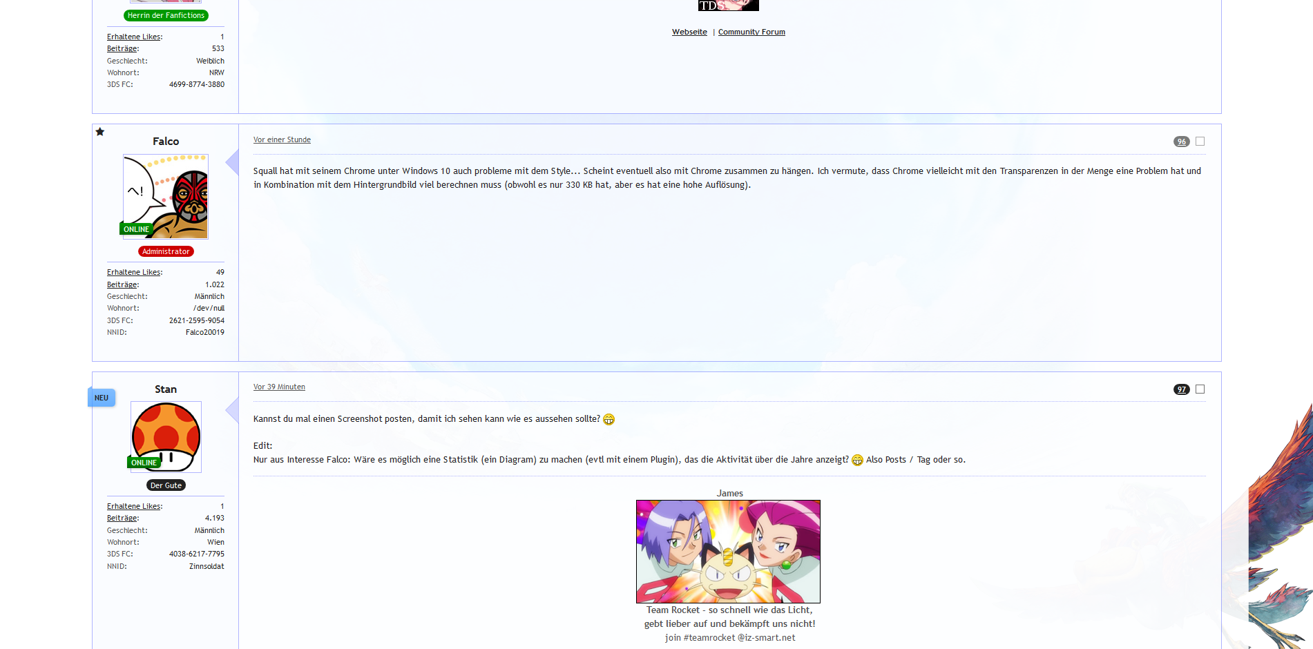 Squall hat mit seinem Chrome unter Windows 10 auch probleme mit dem Style... Scheint eventuell also mit Chrome zusammen zu hängen. Ich vermute, dass Chrome vielleicht mit den Transparenzen in der Menge eine Problem hat und in Kombination mit dem Hintergrundbild viel berechnen muss (obwohl es nur 330 KB hat, aber es hat eine hohe Auflösung).
