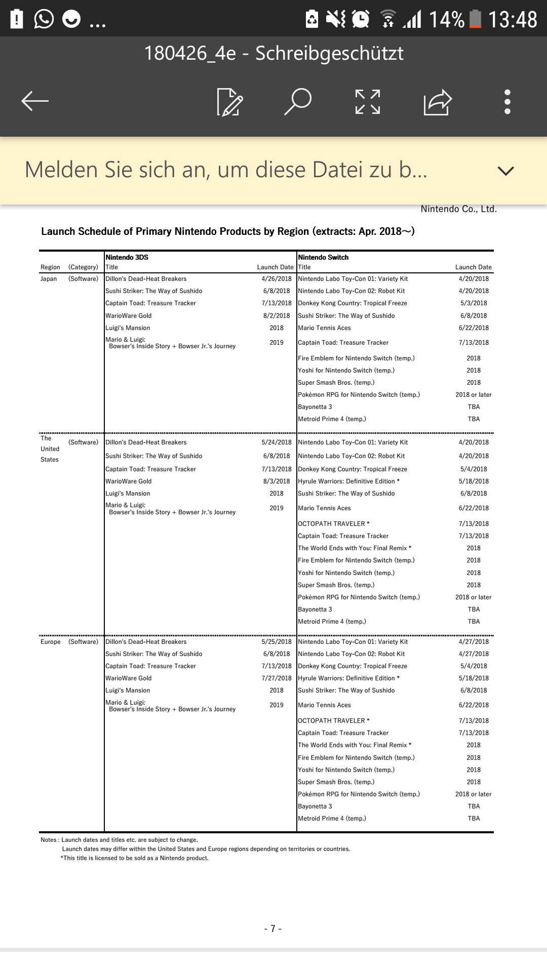 Pokemon ist nach wie vor für 2018 oder später angegeben. Fire Emblem, Yoshi und Smash sind hingegen für 2018 confirmed.