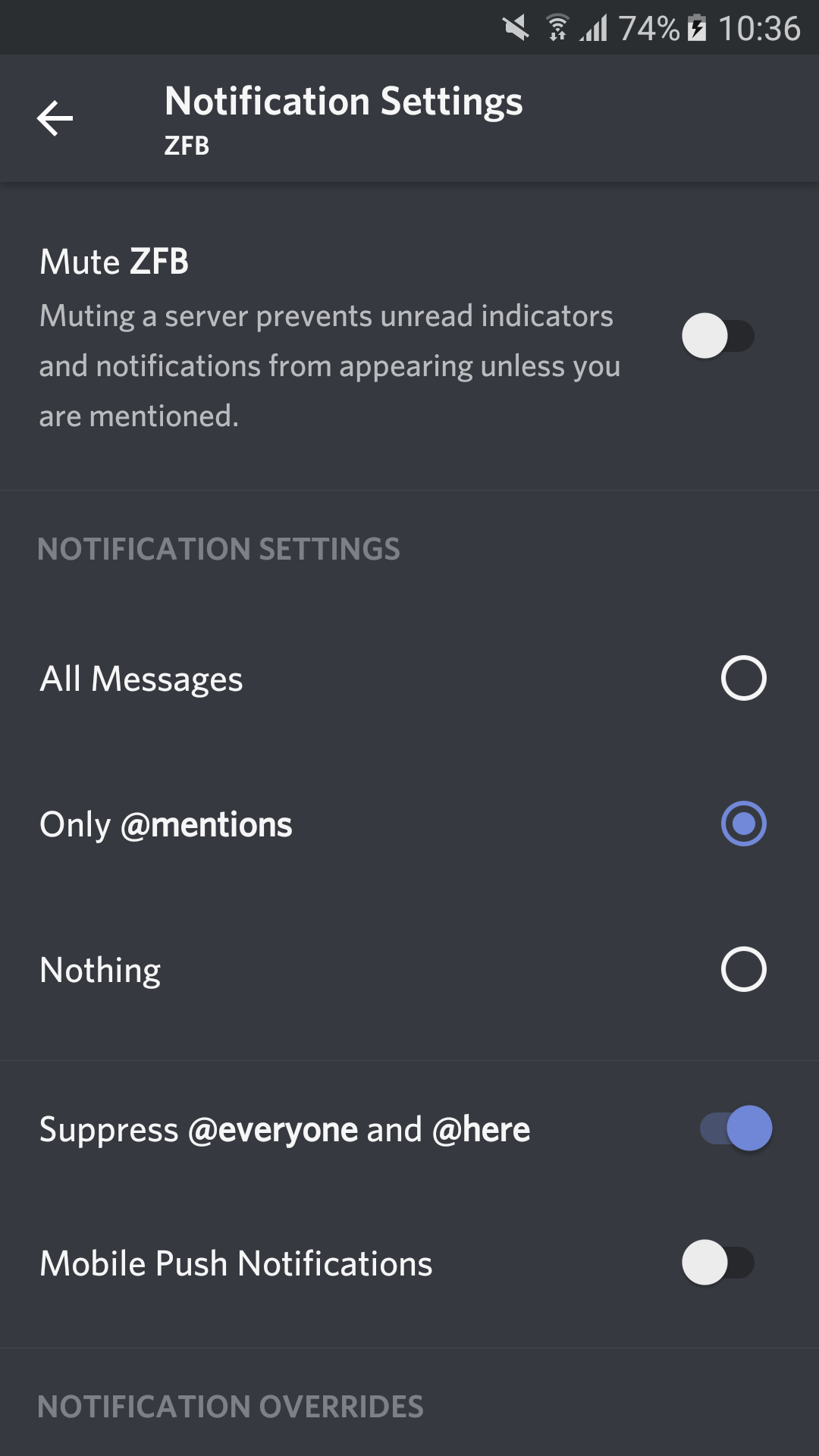 Neuen Discord-Usern empfehle ich, bei jedem neuen Server erstmal die notification settings zu bearbeiten. Als Standard piept und blinkt das Handy nämlich bei jeder einzelnen Nachricht im Channel, daher: mobile push notifications deaktivieren.